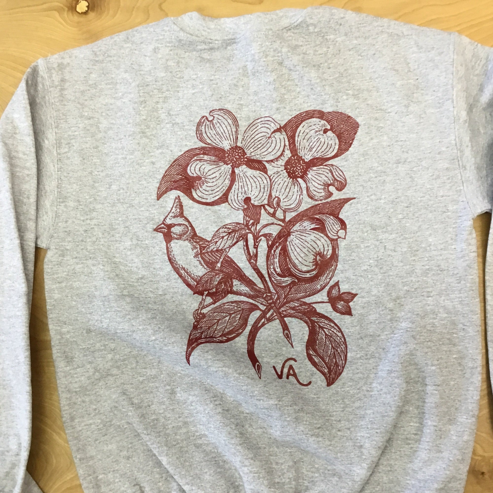 The Virginia state bird and flower together on this comfy sweatshirt. Crimson ink on a gray unisex sweatshirt. Designed and printed by Jeff Guinn.