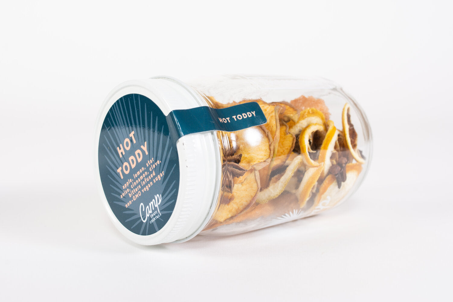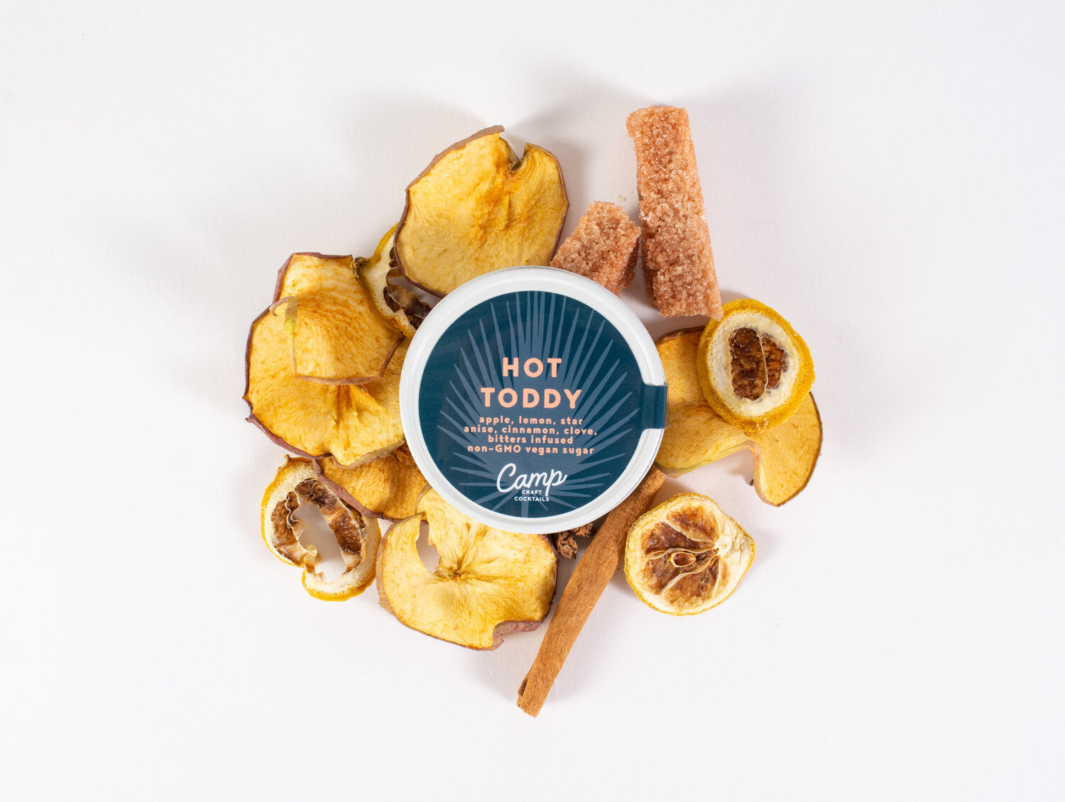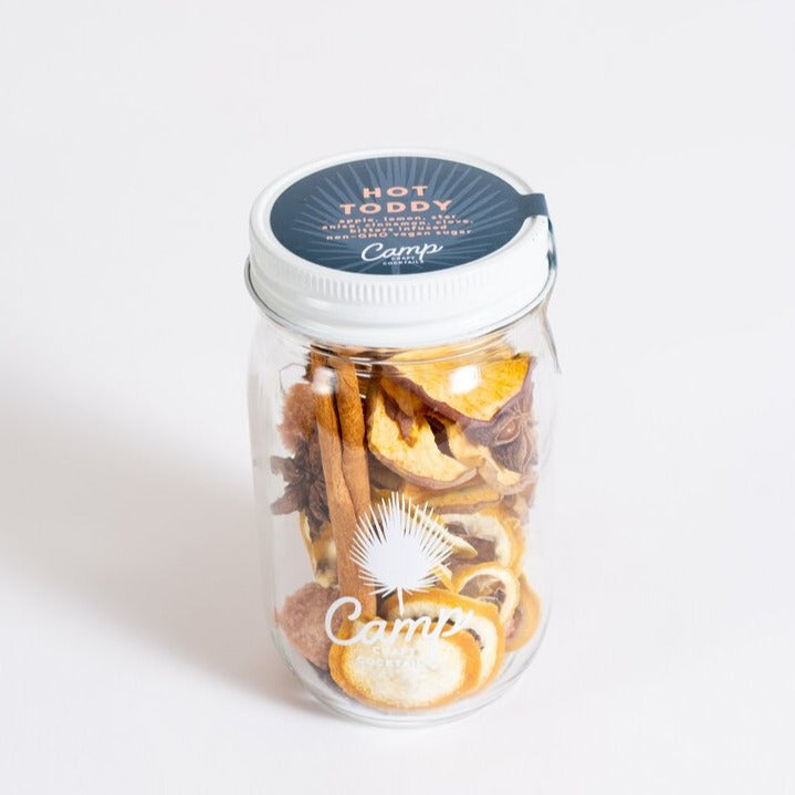 CAMP Craft Cocktails Kit includes:  Apple, Cinnamon, Star Anise, Clove, Lemon, Bitters Infused NON-GMO vegan cane sugar. Add 12 ounces of alcohol, refrigerate for three days while kits infuses. Shake before serving. Sip as is or add hot tea or hot apple cider. Can be served with ice tea or cider depending on preference and climate. Alcohol not included. Serves 8 - 16.