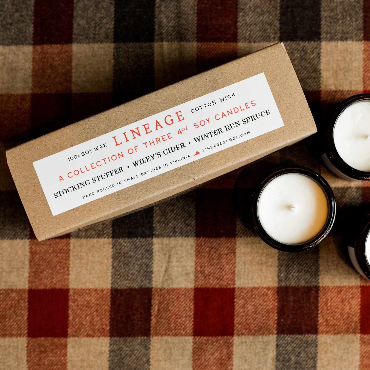 A holiday collection of three 4 oz candles, featuring our popular fall/winter seasonal candles. Packaged in a brown kraft gift box, this would make the perfect gift for Christmas or any occasion during the holiday season. This gift set is also a great way for customers to explore our holiday fragrances.