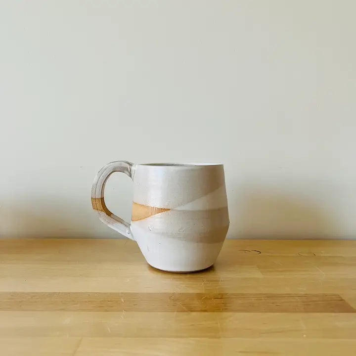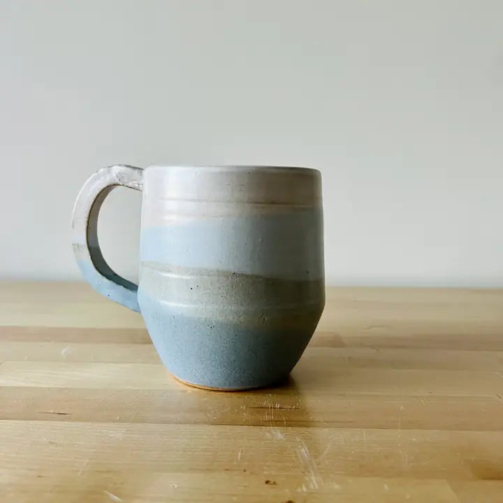 Beveled 12oz coffee mug, cross-dipped in warm white or ocean blue glaze. Height - 4.25" Opening - 3.25 across