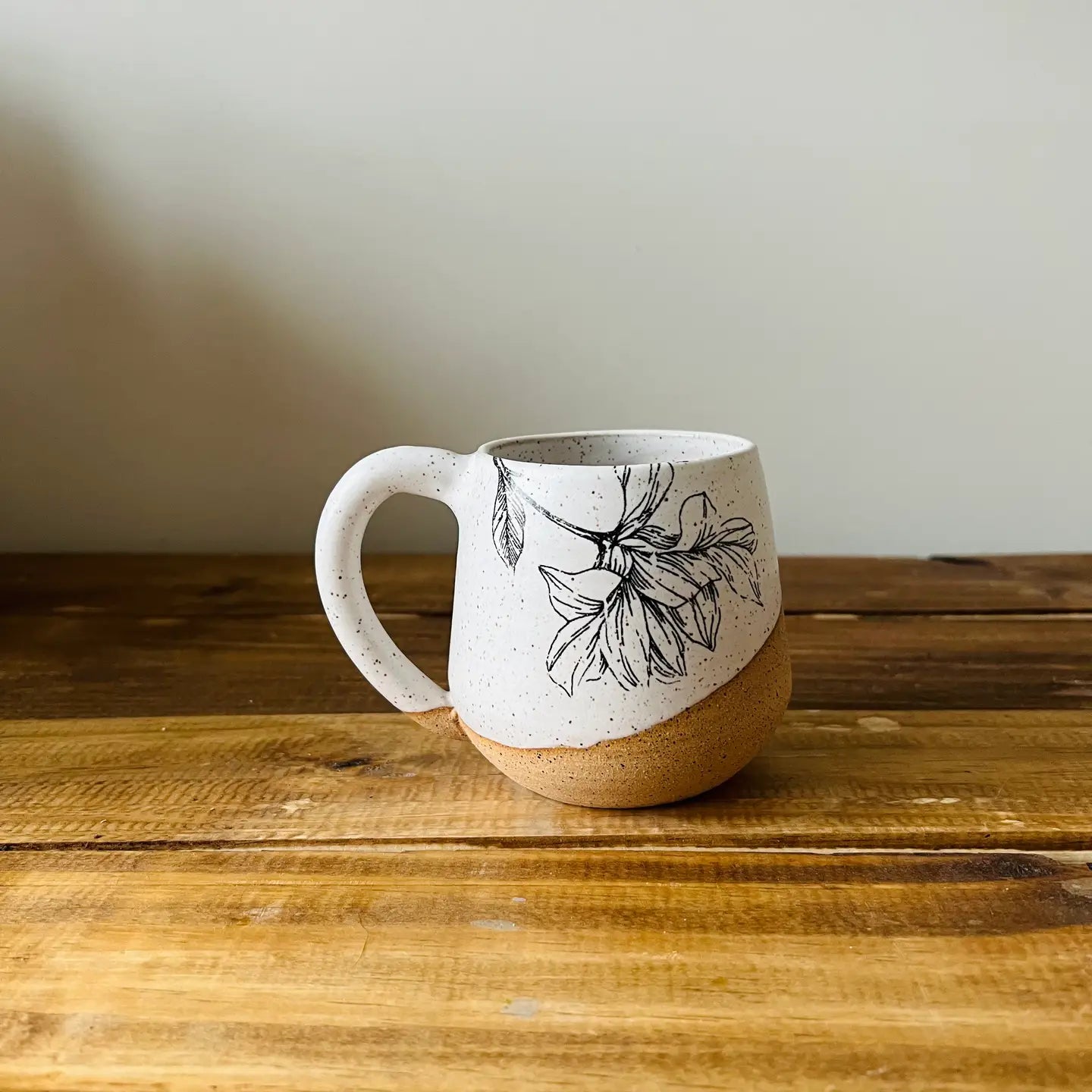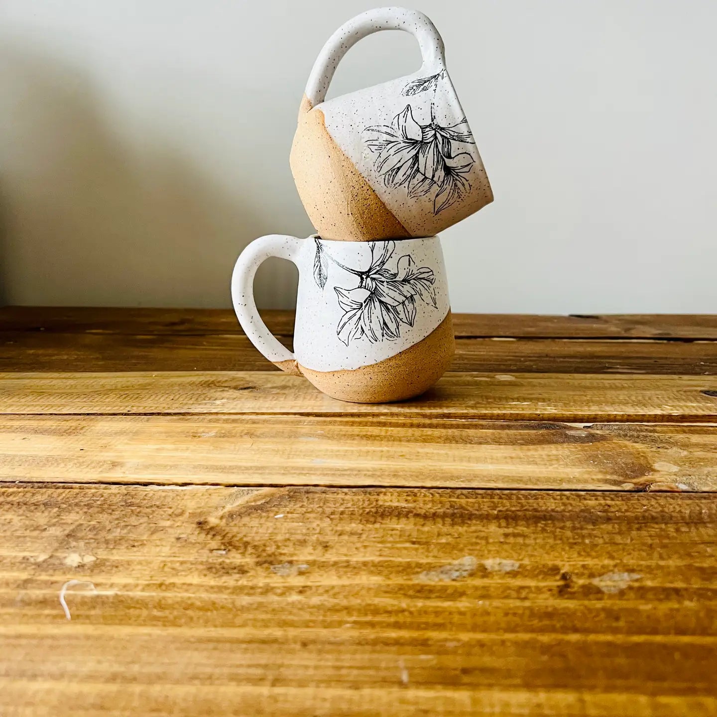 These modern coffee mugs were thrown on the potter's wheel using stoneware clay, affixed with a handle, then dipped in a warm white glaze and finished with an overglaze flower design. Each mug is unique.