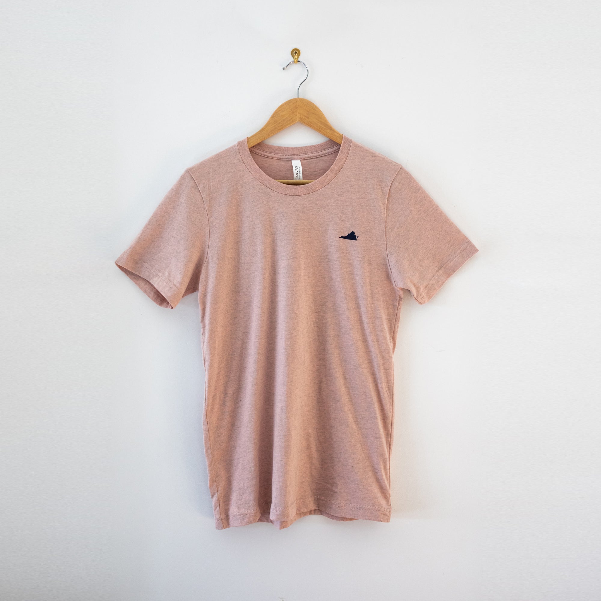 The Virginia state bird and flower together on this comfortable t-shirt. Dark blue ink on heather salmon unisex t-shirt. Designed and printed by Jeff Guinn.
