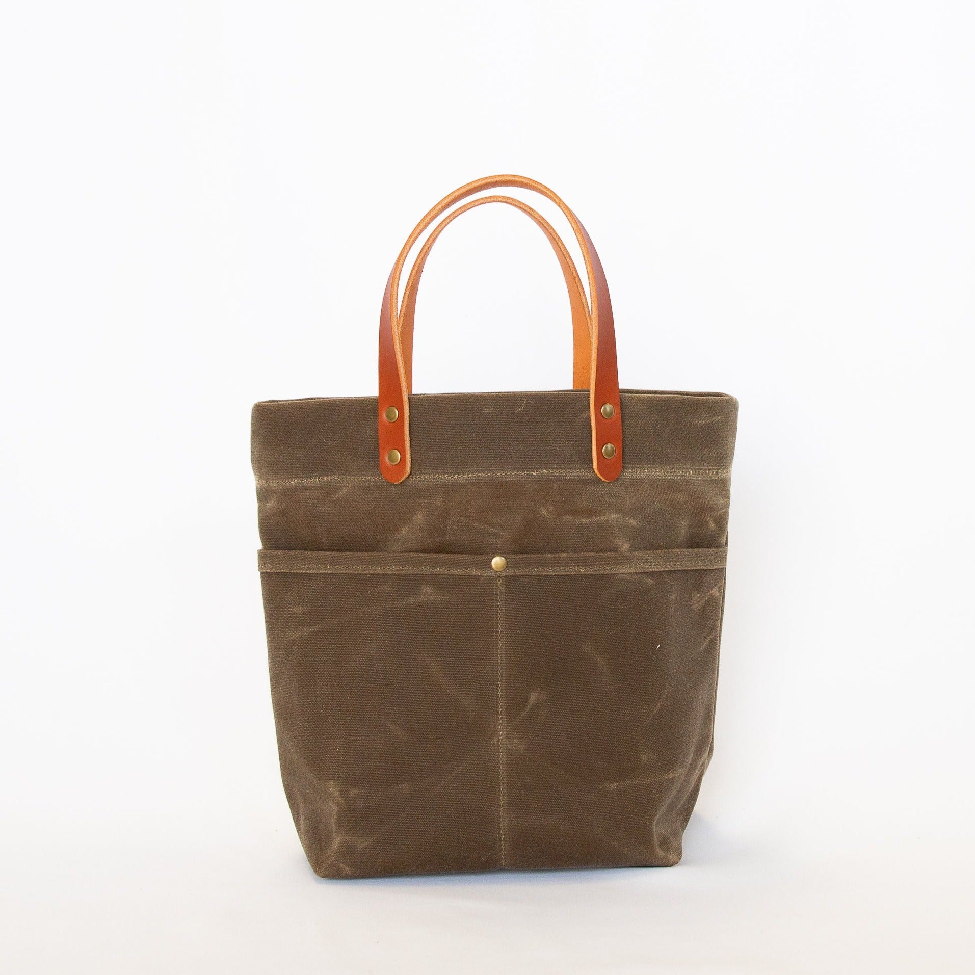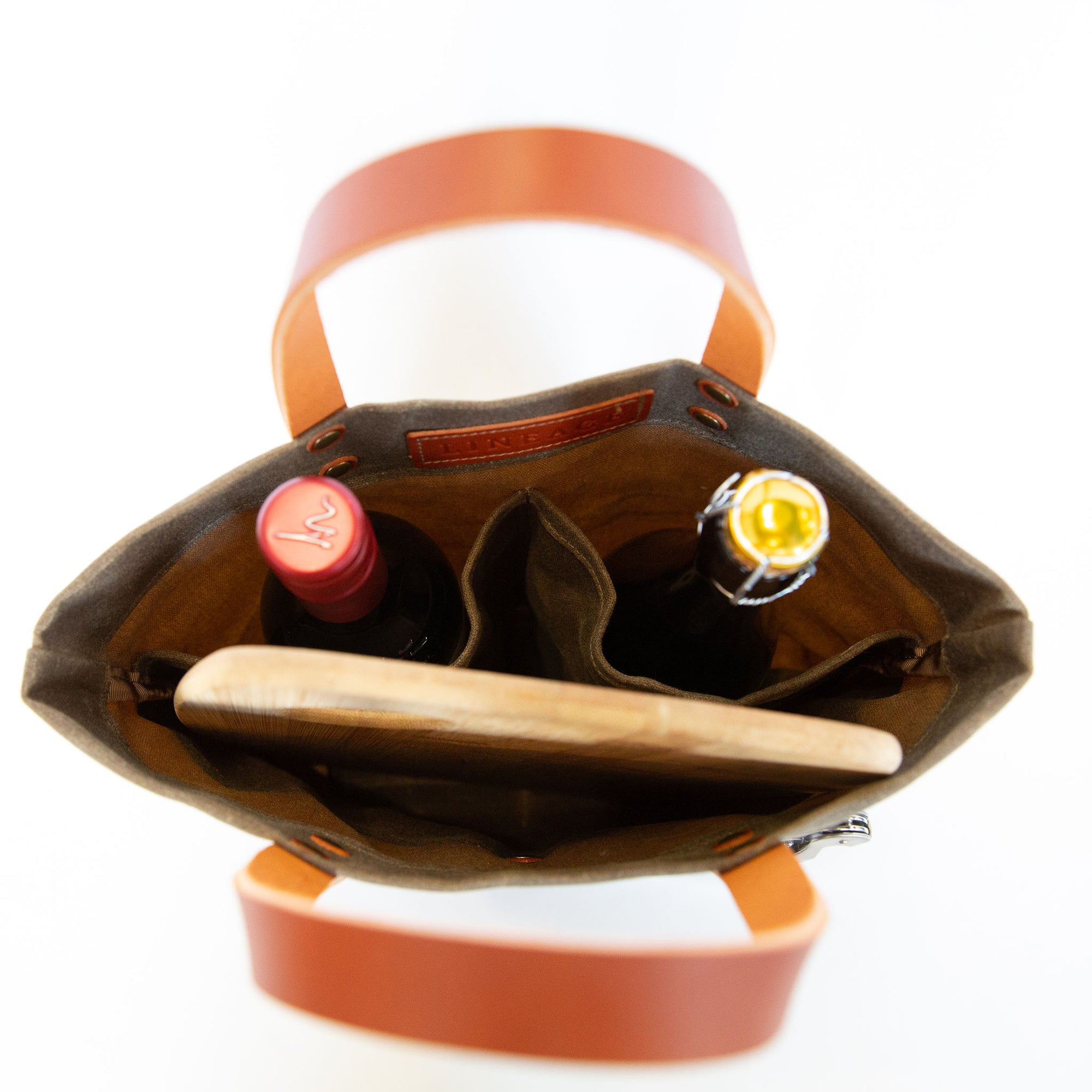 The Bottle Tote is a simple, waxed canvas bag for carrying your favorite beverages in style. It features an interior divider for carrying two 750ml bottles of craft beer, cider, wine, or spirits, plus a little extra room for a few small items such as a cheeseboard, cups, or snacks. The exterior features two small pockets for storing items such as a bottle opener, corkscrew or pocketknife. The padded bottom panel helps to keep your glassware safe and adds a flat bottom for when you set it down.
