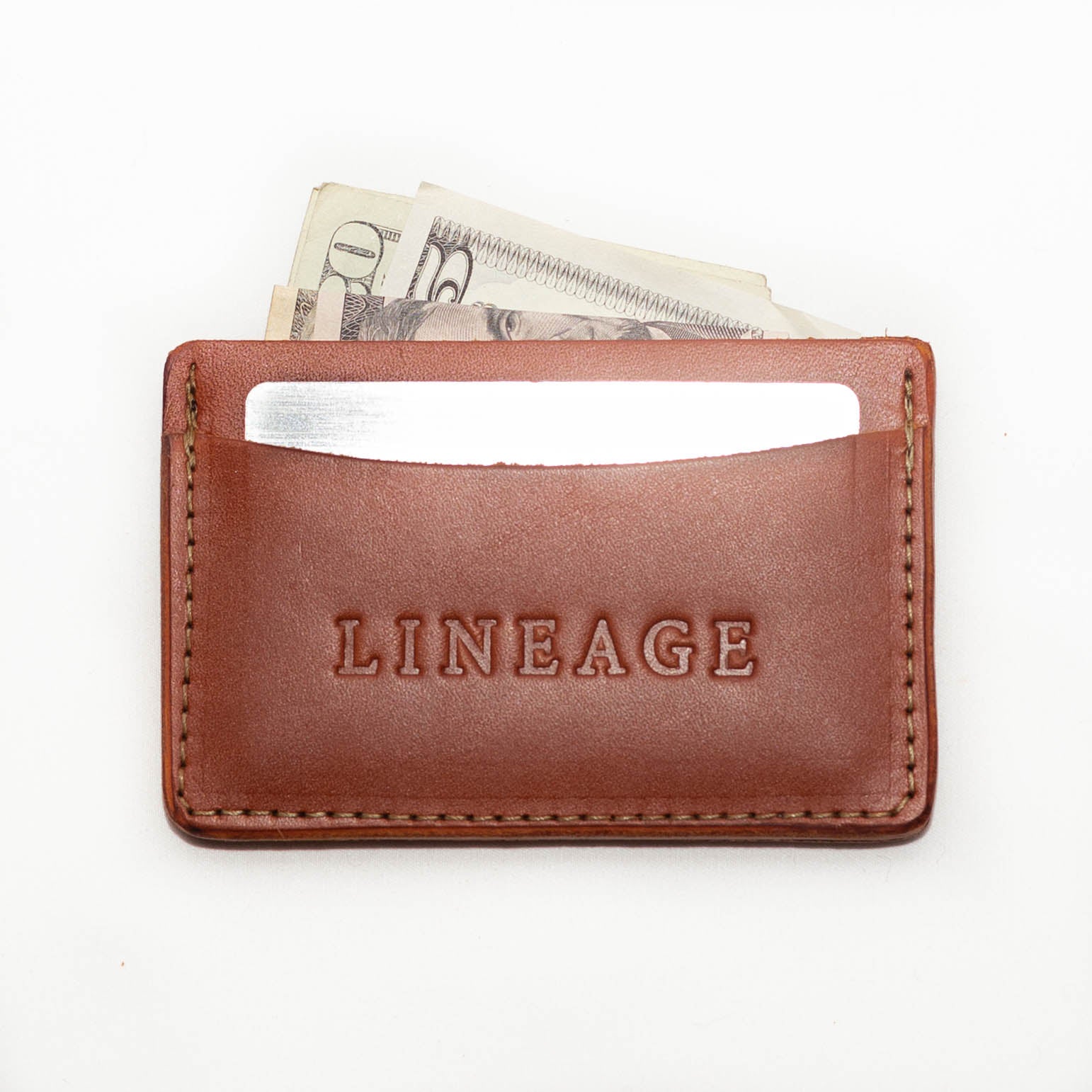 A simple leather wallet with three pockets for carrying a few cards and folded cash. Though pockets will be tight at first, the leather slots will expand with use to allow room for additional cards.