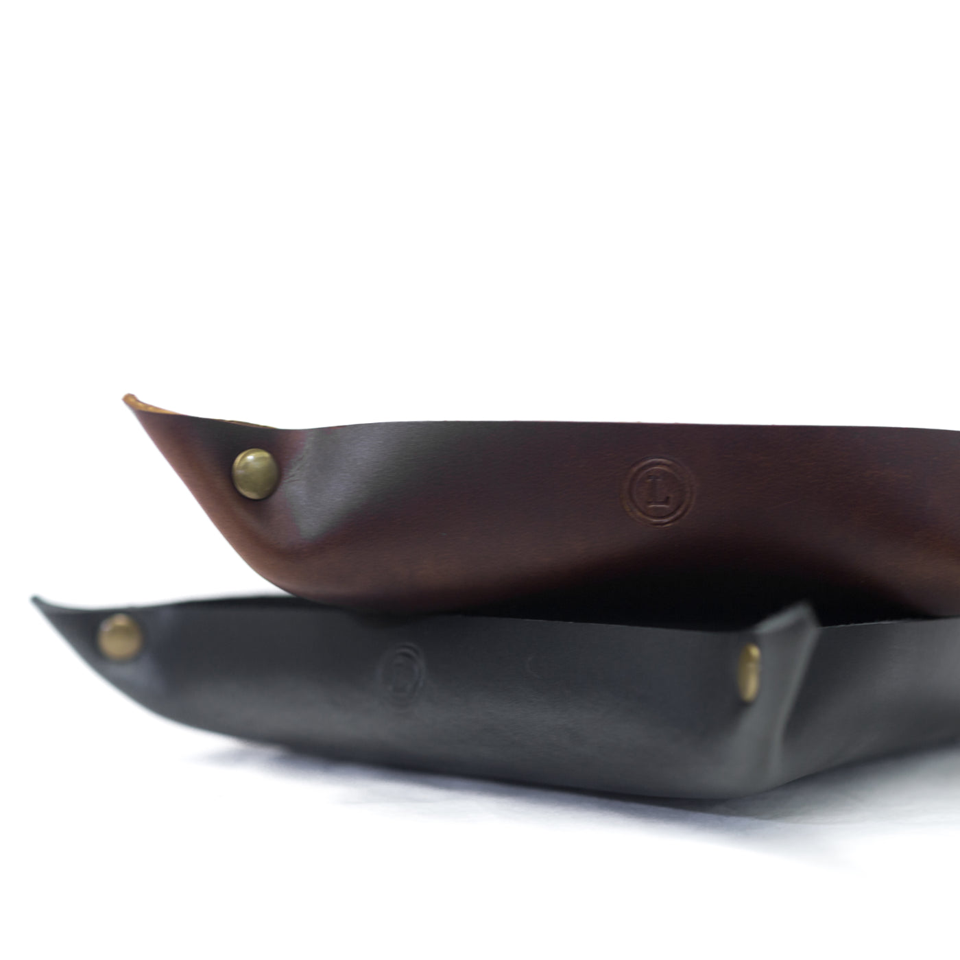 Our leather valet tray is a perfect catch-all for keeping your everyday carry essentials and accessories organized in one spot. Made with full grain leather and antique brass rivets.