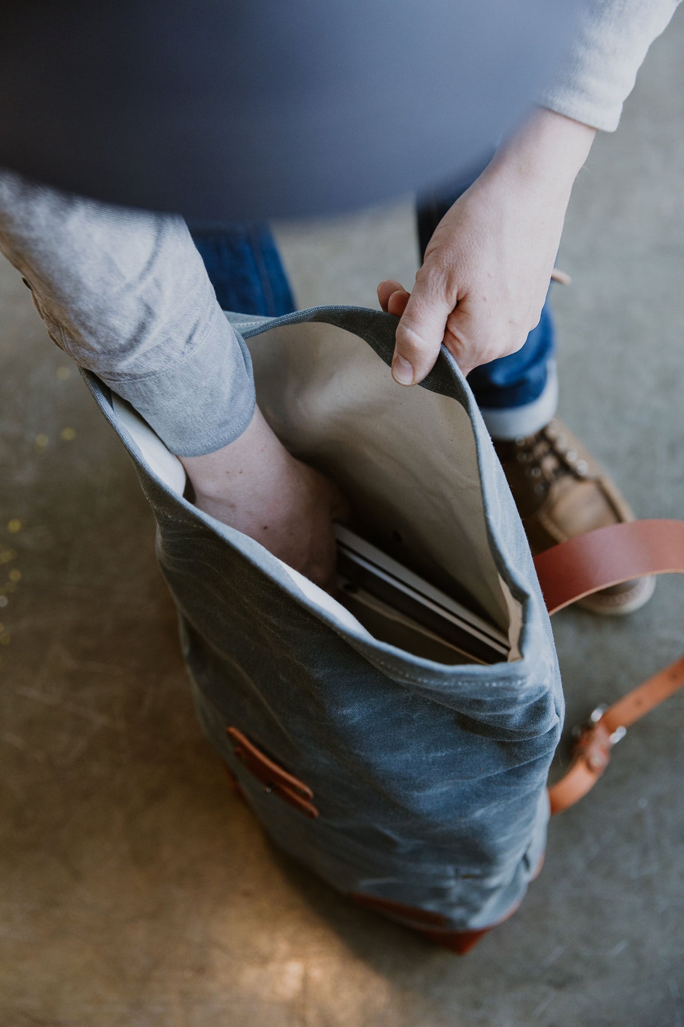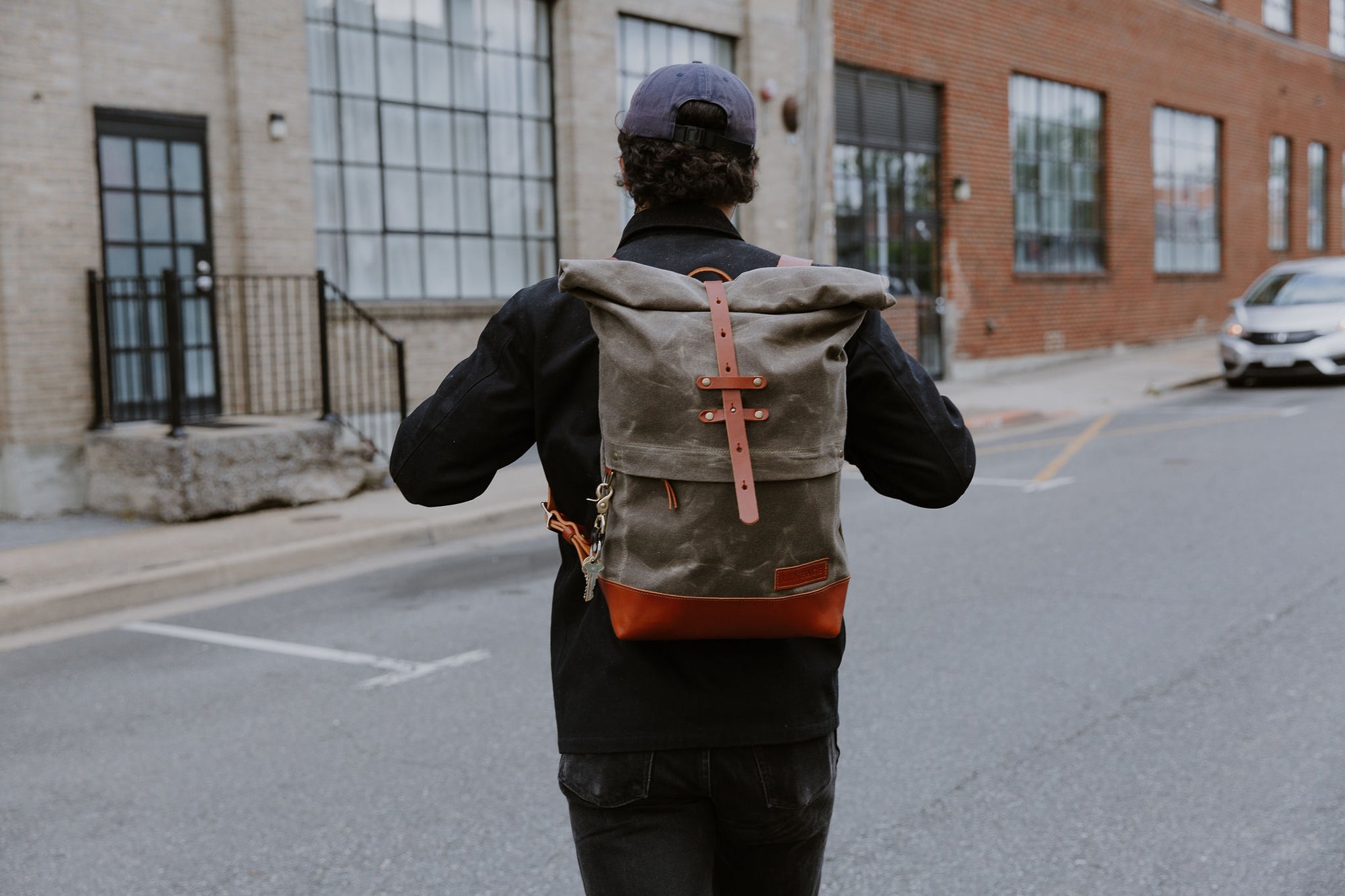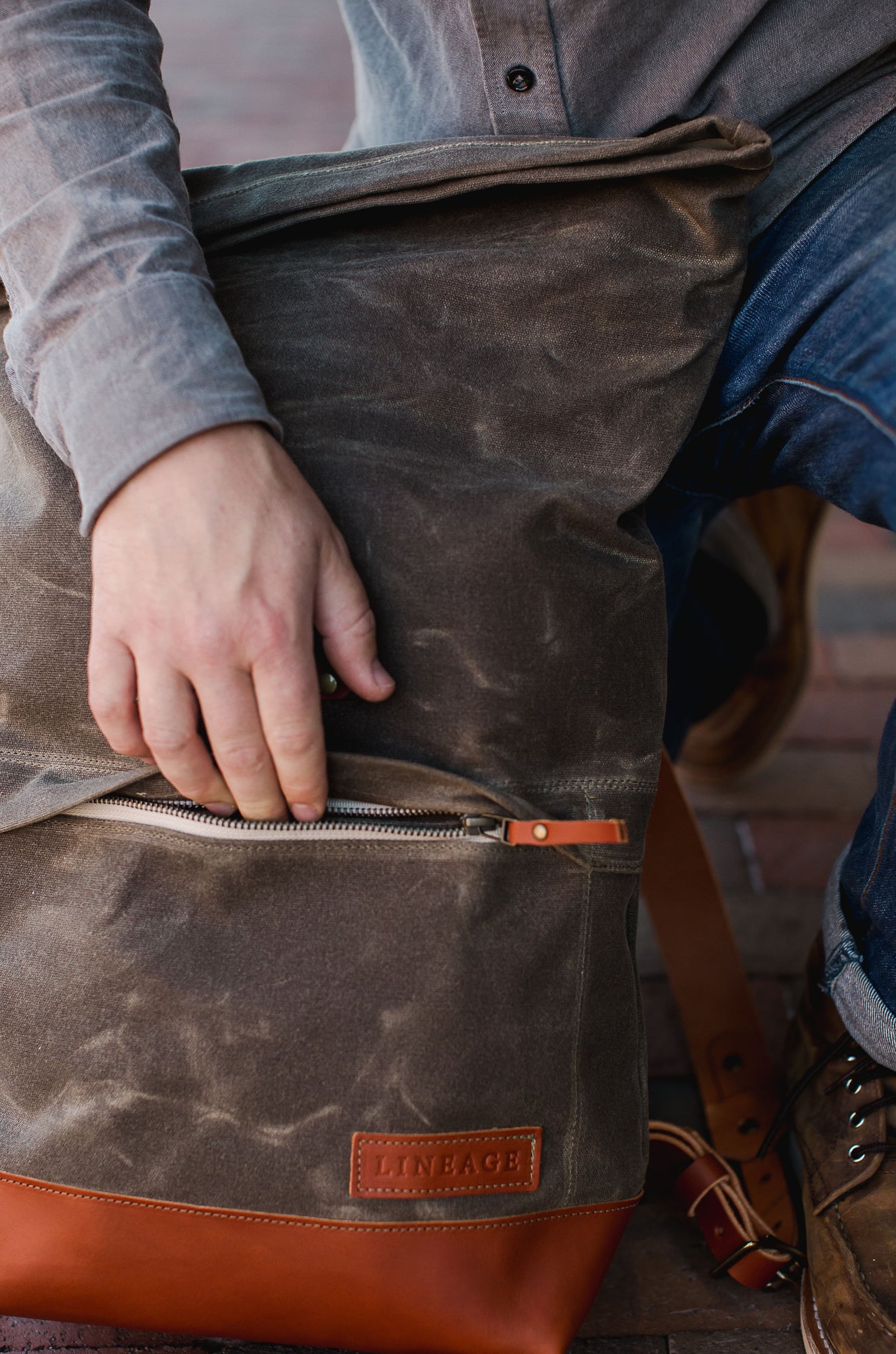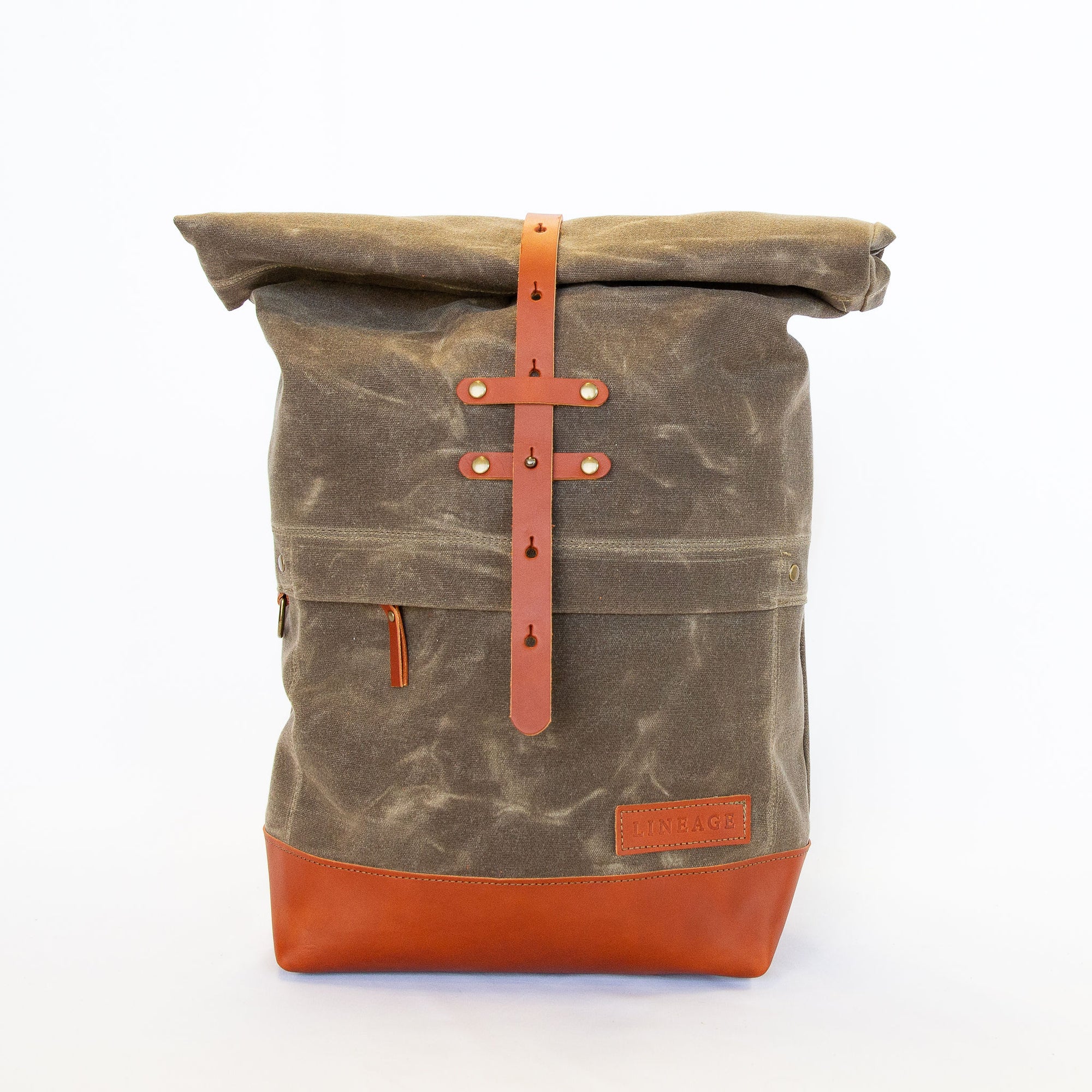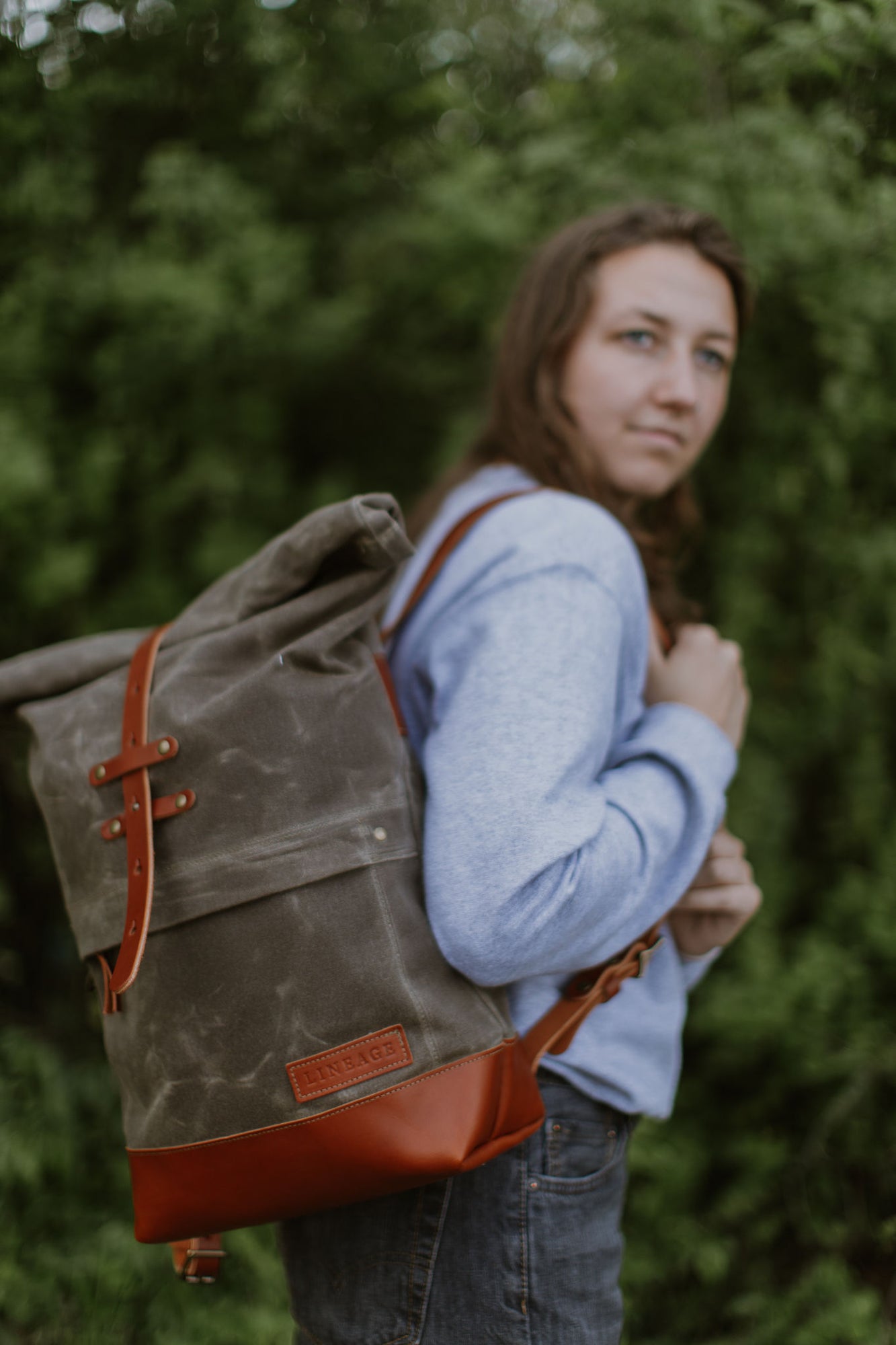 The Appalachian is a full size roll-top backpack made for everyday adventures. Carry your essentials for a day at the office, on campus, or an escape to the woods. Made with our incredibly durable waxed cotton canvas, natural canvas lining, chestnut bridle leather, and antique brass hardware.