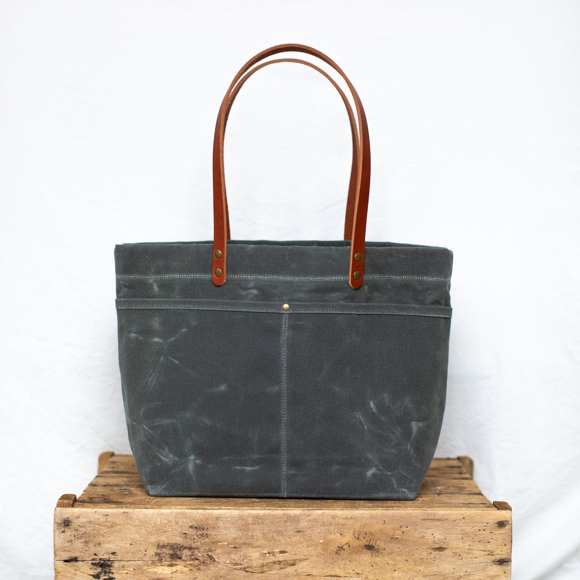 The Mountain Laurel is our larger waxed canvas tote bag - simple, elegant and versatile, with a large main compartment and eight pockets for optimal organization. Perfect for the office, farmers market, gym, beach, picnics, a night out on the town, as a diaper bag, or overnight bag.