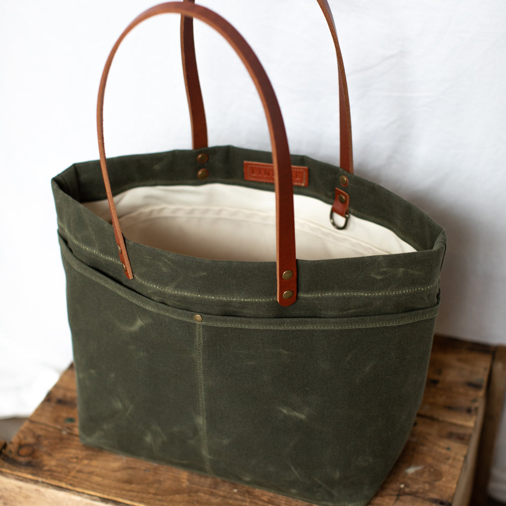 The Mountain Laurel is our larger waxed canvas tote bag - simple, elegant and versatile, with a large main compartment and eight pockets for optimal organization. Perfect for the office, the farmers market, the gym, the beach, a night out on the town, as a diaper bag, or overnight bag. The Chestnut Bridle leather straps feature a 10" drop so that it can be carried on your shoulder or by your side. The leather will soften and darken with daily use and exposure to sunlight, developing into a rich, brown patina. Handcrafted in Richmond, Virginia.