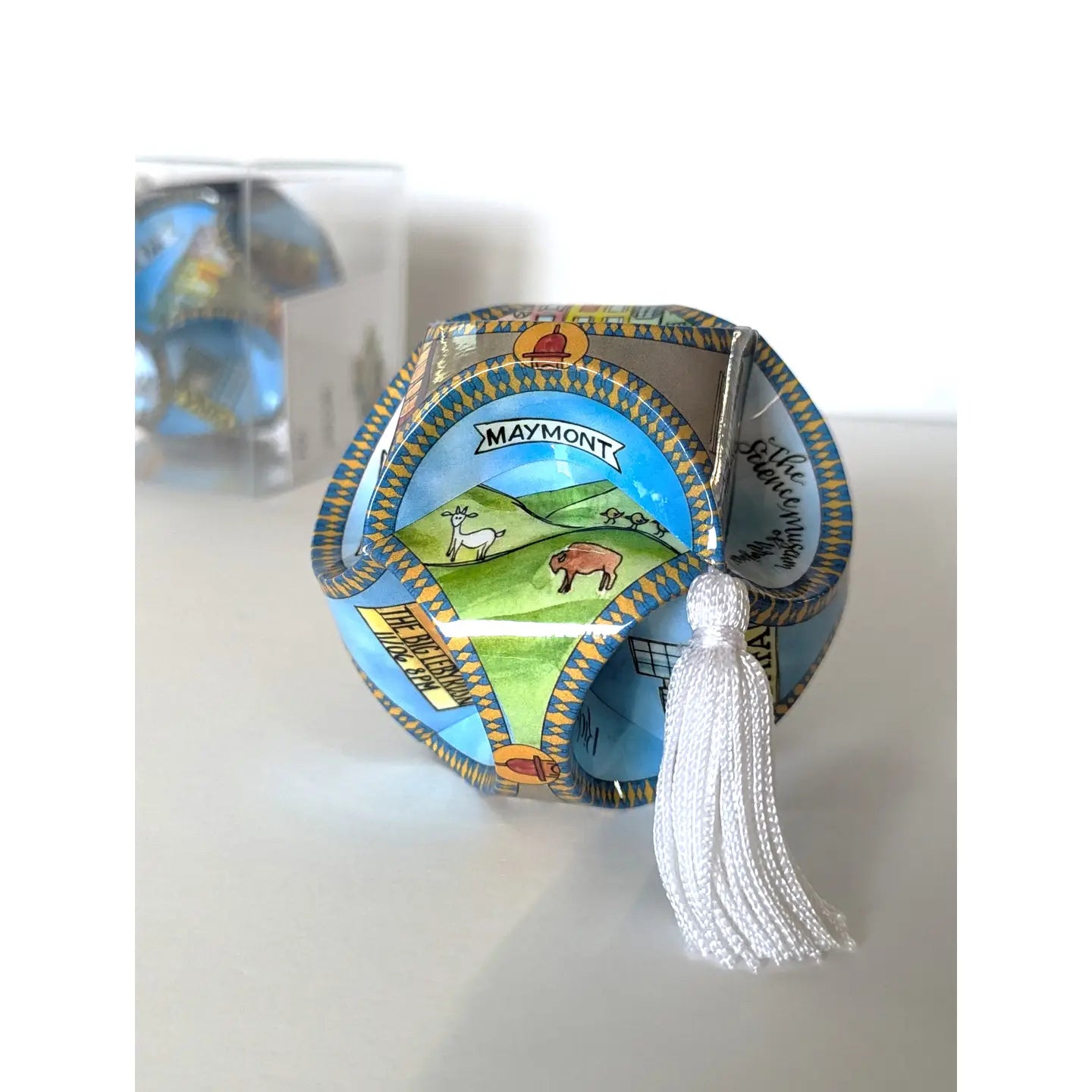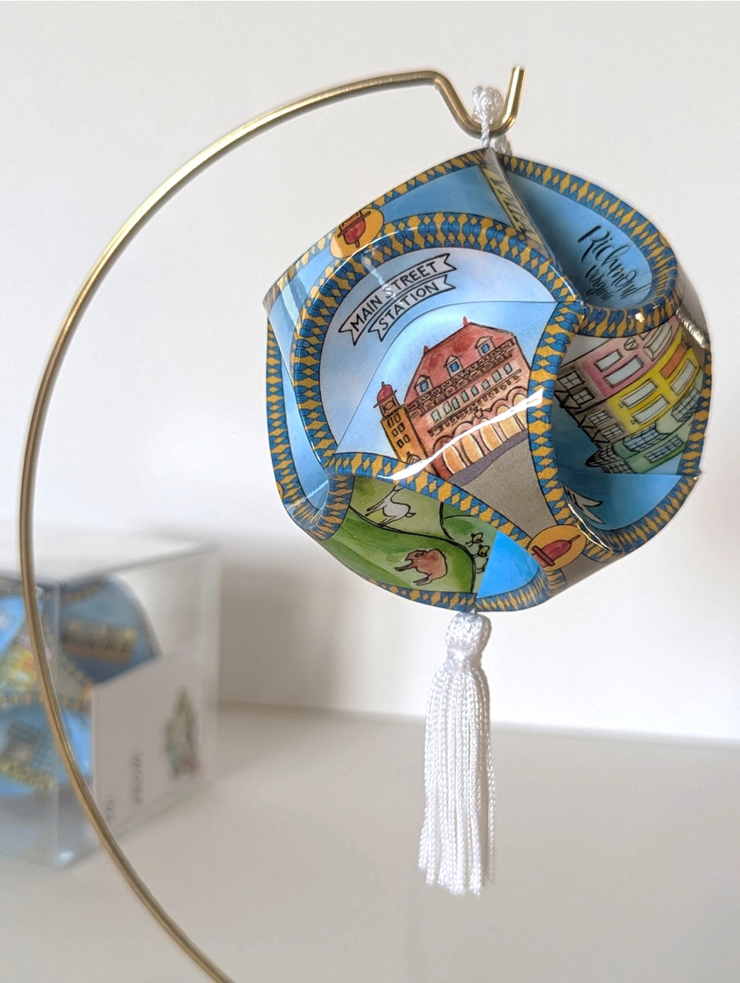 Paper Globes with tassel. 3" Ornament features best-selling Mad Kitchen Co. Richmond, VA art with a glossy finish. Ornament includes a clear plastic box and a paper tag with Mad Kitchen Co. logo and space for a price tag.