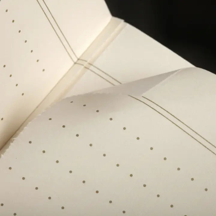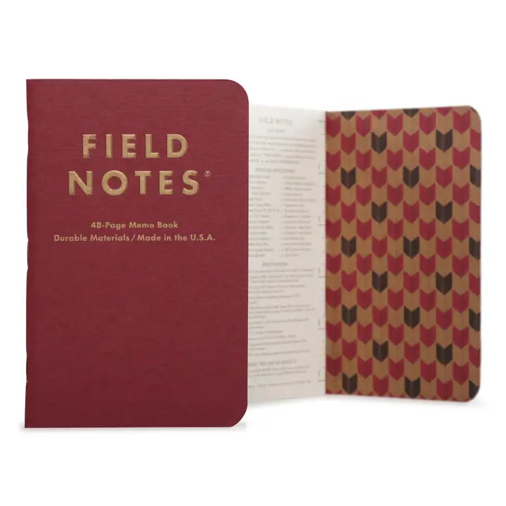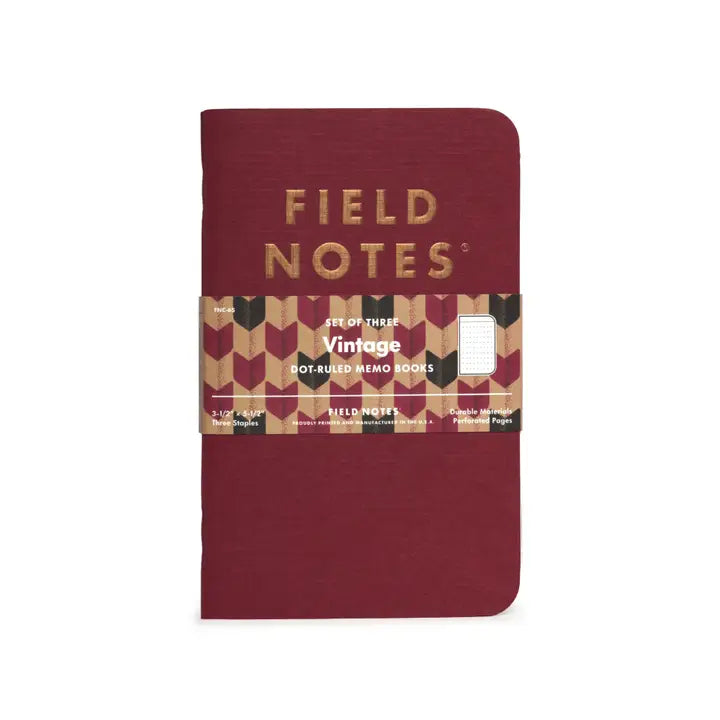 65th limited Quarterly Edition for the winter of 2024 is the “Vintage” Edition. Field Notes revisited some of their favorite materials, details, and production processes to create a brand-new and old-fashioned 3-Pack. For the covers, they have chosen a 100# “Royaltone” stock from the French Paper Company. It is named “Monarch Red,” but leans more towards the color of fine wine. Perhaps a 2012 Willamette Pinot Noir? The stock features a lovely linen texture that plays well with the embossed “Metallic Antique” gold ink. The inside covers are printed with a geometric pattern that suggests the end-papers of a classic hardcover book. Interior pages are “dot-ruled” using “Faded Antique Gold” ink on an off-white stock from Domtar. They’re also perforated for easy removal. The staples are also gold.