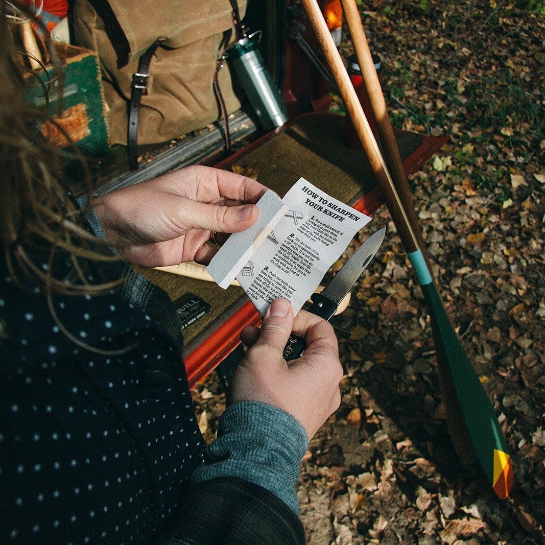 Measures approximately 3" x 1" x 1/4”. Sharpening instructions included.