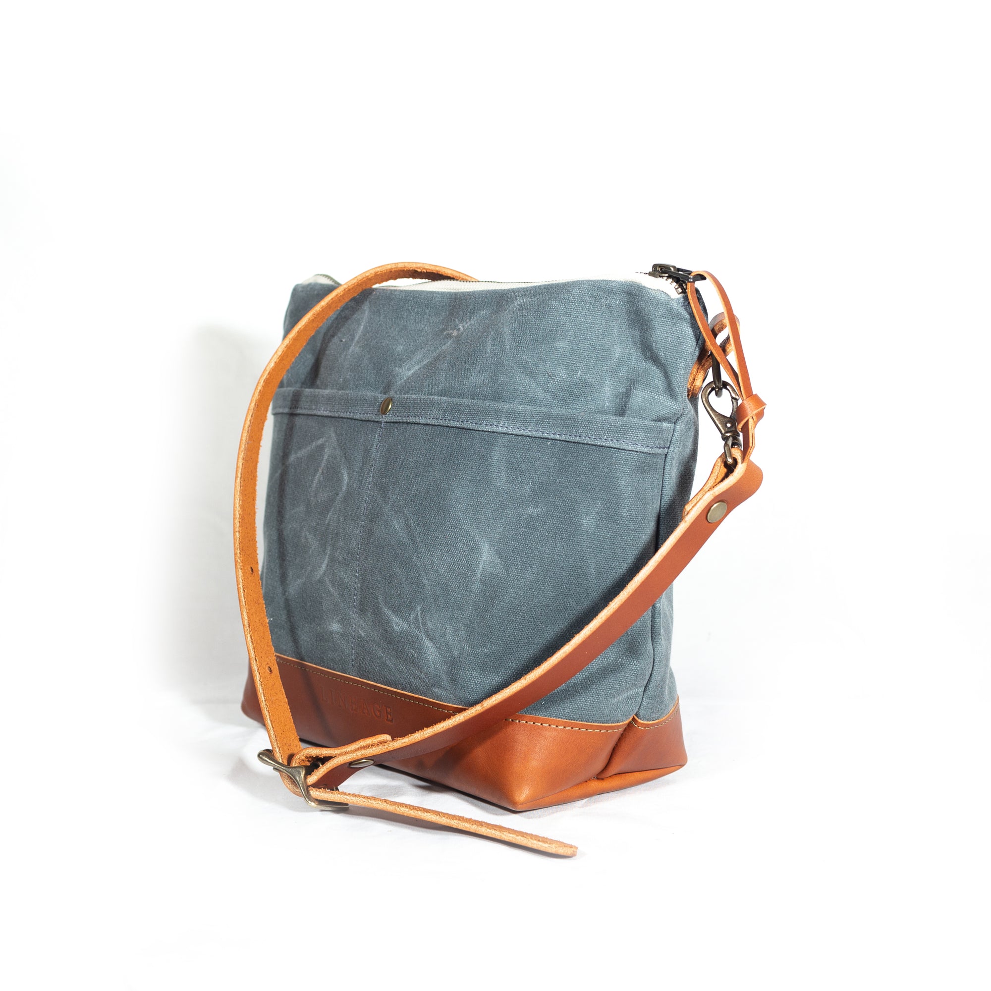 Features waxed canvas exterior, cotton duck lining, zippered main compartment, two small interior pockets, two exterior pockets, and a leather bottom panel for added durability and elegance. The removable shoulder strap adjusts for a variety of lengths, from 38"-46". The Chestnut bridle leather will soften and darken with daily use and exposure to sunlight, developing into a rich, dark brown patina. Handcrafted in Richmond, Virginia.