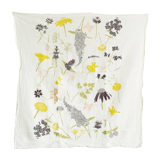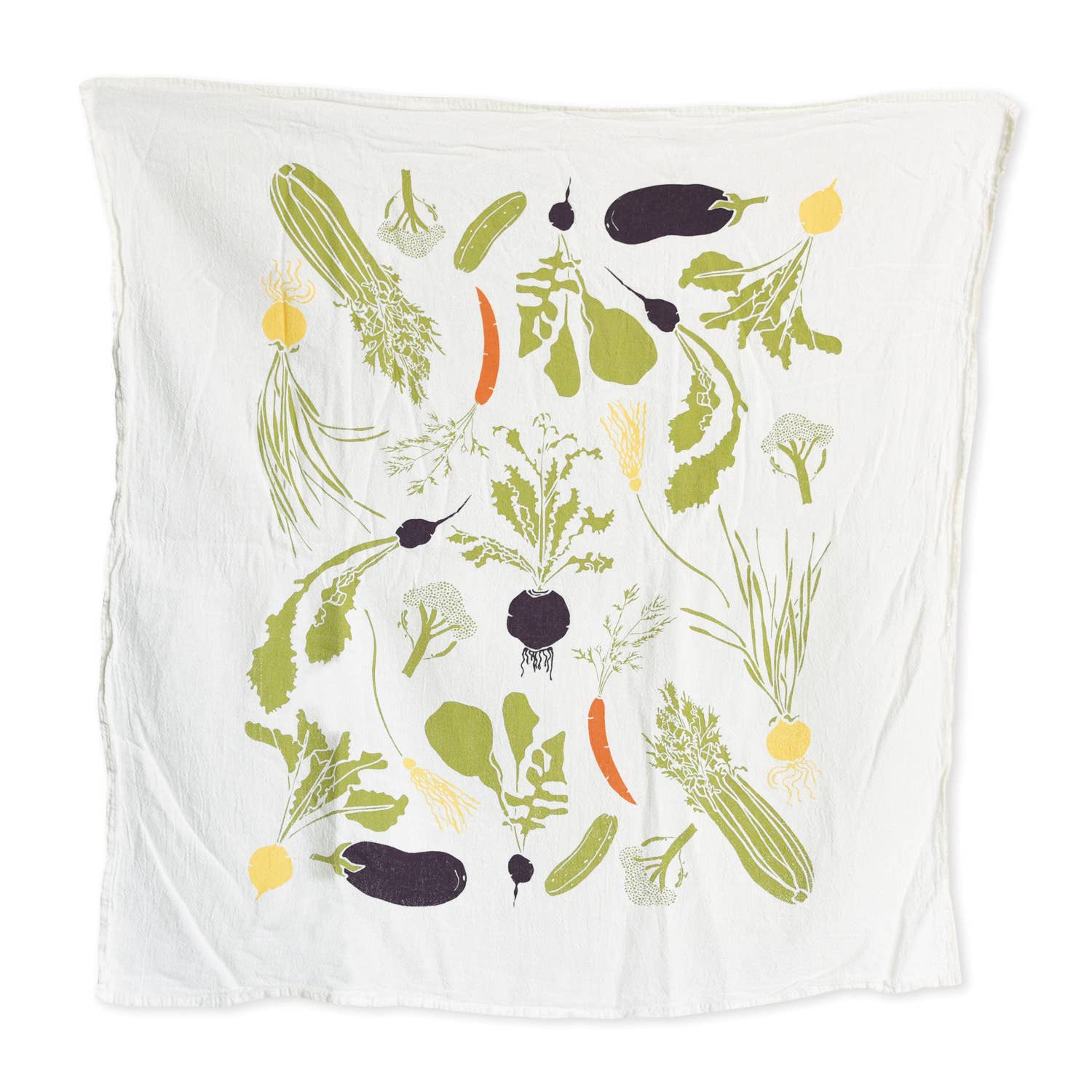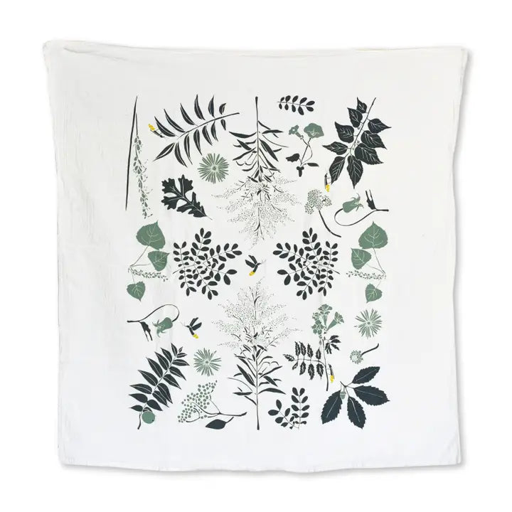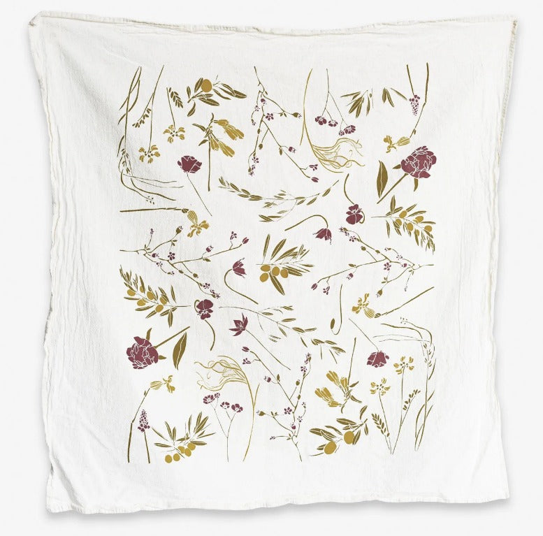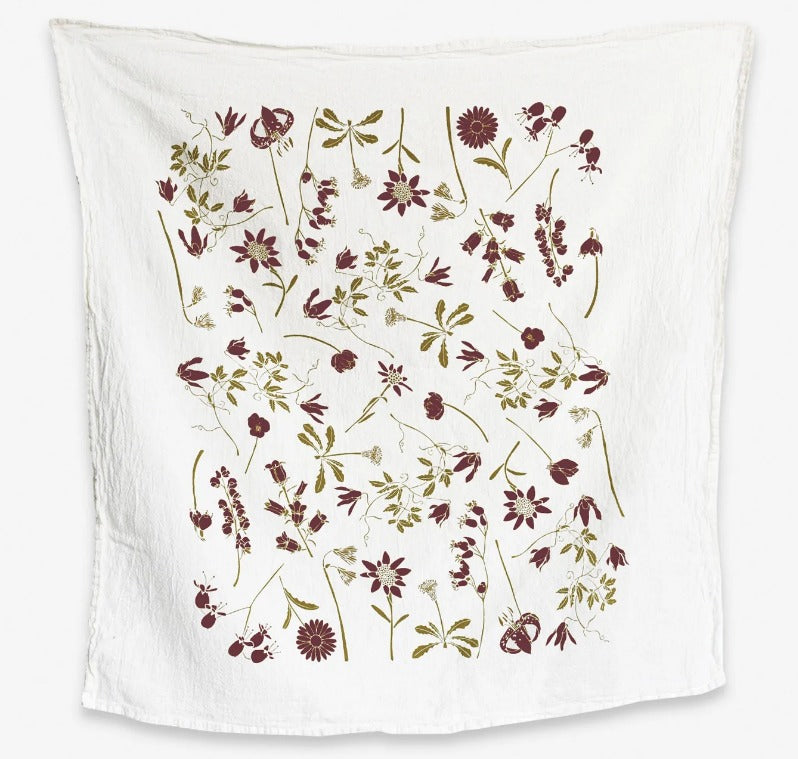Handprinted flour sack kitchen towels featuring colorful floral and herb illustrations. Various designs available.