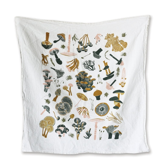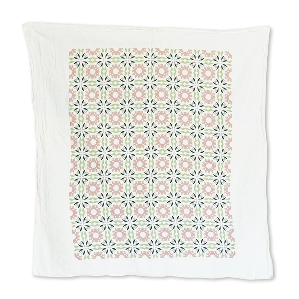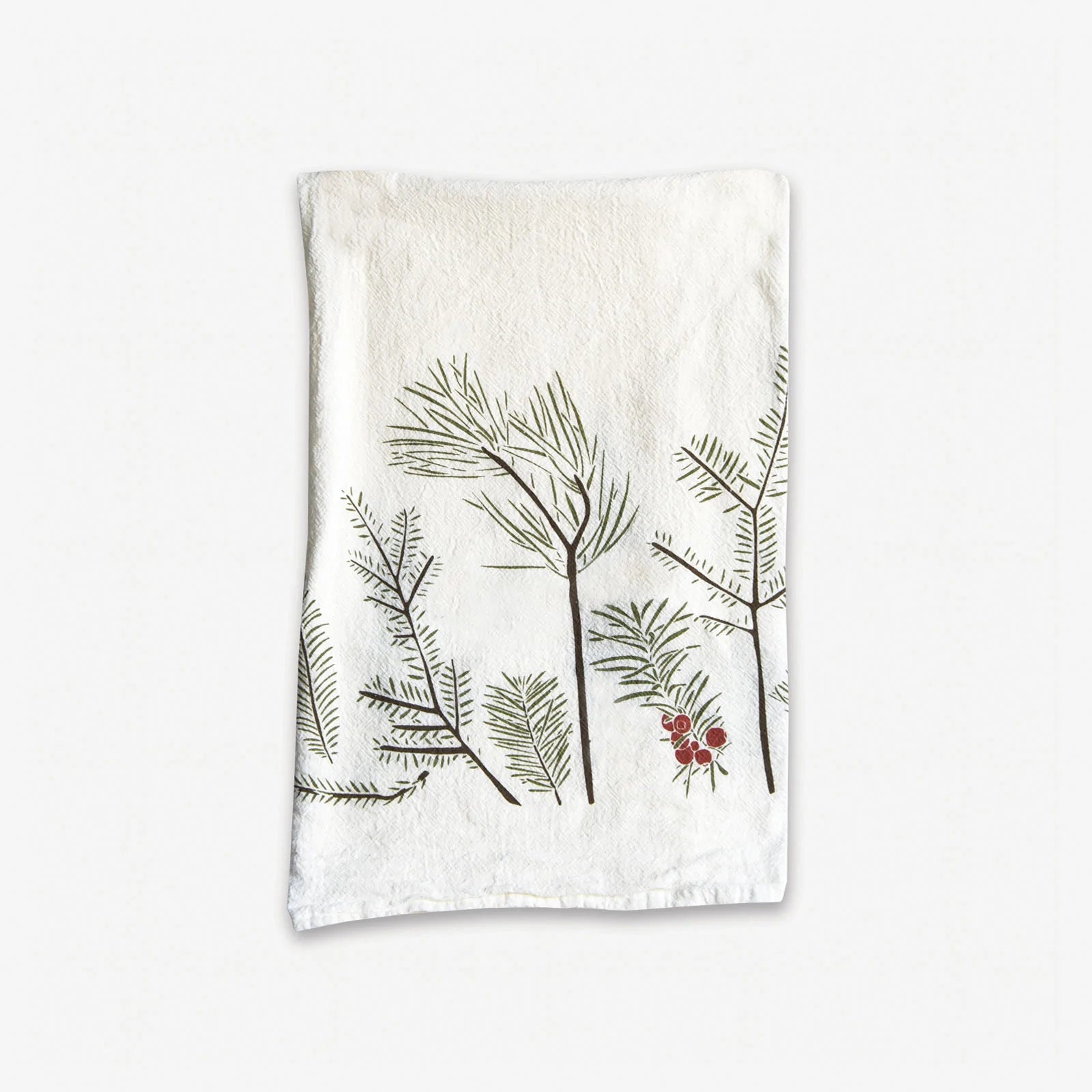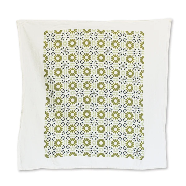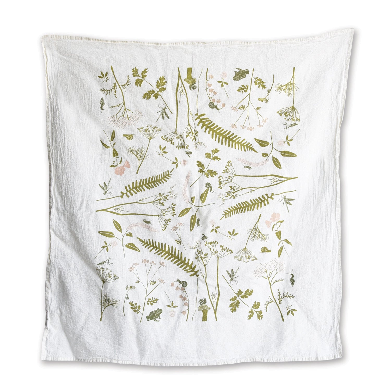 Handprinted flour sack kitchen towels featuring colorful floral and herb illustrations. Various designs available.