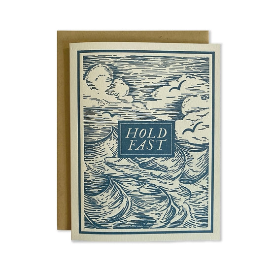 Letterpress printed by hand in a marine blue ink, the press creates a subtle raised texture of embossed oysters beautiful suede-like texture on the paper. These illustrated greeting cards are blank on the inside and printed, scored, and folded by hand on cotton paper.